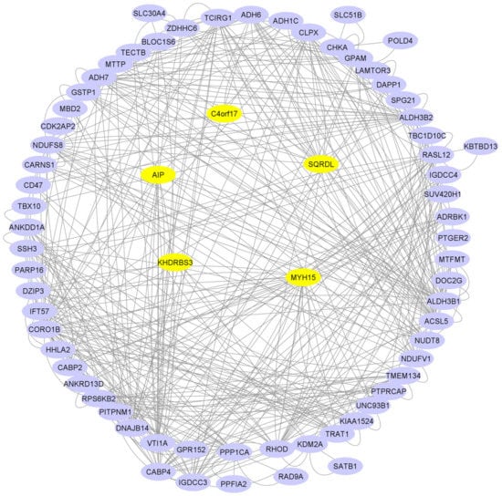 Protein–protein interactions between genes associated with body size traits in Chinese Holstein. (In the yellow nodes, significant candidate genes and their interactions are illustrated).