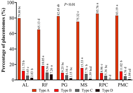The effects of the experimental treatments on placentomal morphology are shown in Figure 1. Ewes in the PMC and RPC groups had predominantly type A placentomes compared with those in the AL, RF, and MS groups (p < 0.01), whereas the percentage of this type of placentome was similar in ewes from the PG, PMC, and RPC groups (p > 0.05). The highest percentage of type B placentomes was found in the placentas of RF and MS ewes (p < 0.01), with RF and PMC ewes having the highest and lowest percentage of type C placentomes, respectively (p < 0.01). In addition, feed restriction without supplementation led to the highest percentage of type D placentomes among all treatment groups (p < 0.01).