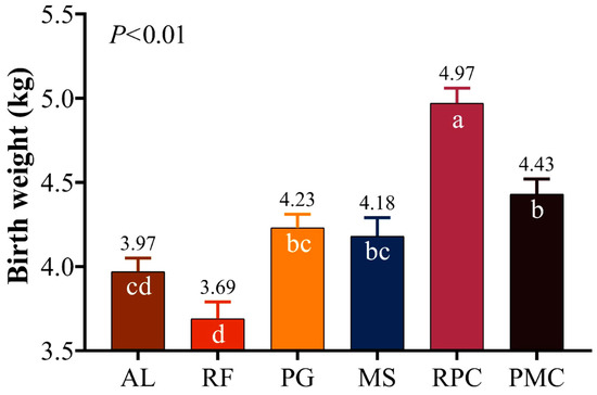 The combined supplementation of propylene glycol and rumen-protected choline chloride to the restricted diet of ewes resulted in the highest birth weight among the treatment groups (Figure 2) (p < 0.01). Lambs born from PMC ewes were heavier at birth than those born from AL and RF ewes (p < 0.01). At the same time, the body weight of lambs born from PG and MS ewes was better than that of lambs born from RF ewes (p < 0.01). The numerically lowest birth weight was found in lambs born from RF ewes, and it was not significantly different from that of AL lambs (p > 0.05).