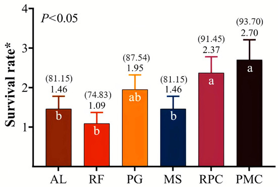 The results of the analysis showed that lambs born from PMC and RPC ewes had a higher survival rate until weaning than those born from MS, RF, and AL ewes (Figure 2) (p < 0.05), while the survival rate of PG lambs was comparable to these two categories.