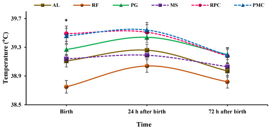 Effect of feed restriction and supplementation with propylene glycol, monensin sodium, and rumen-protected choline chloride in late pregnancy on the rectal temperature of lambs during the first three postnatal days. AL = ad libitum feed intake; RF = restricted feeding; PG = restricted feeding plus propylene glycol; MS = restricted feeding plus propylene glycol and monensin sodium; RPC = restricted feeding plus propylene glycol and rumen-protected choline chloride; PMC = restricted feeding plus propylene glycol, monensin sodium, and rumen-protected choline chloride. Values are means with their standard errors being shown by vertical bars. Mean values differ significantly at each time point: * p < 0.05.