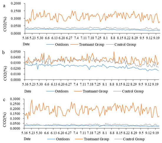 The variation trends in CO2 concentration throughout the experimental period: (a) The variation trends in CO2 concentration all day; (b) The variation trends in CO2 concentration during the light period (9:30–16:30); (c) The variation trends in CO2 concentration during the dark period (16:30–9:30 next day).