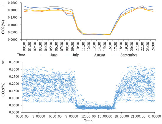 In this study, the dates from 5.21 to 6.20 comprised the first month, June, the dates from 6.21 to 7.20 comprised the second month, July, the dates from 7.21 to 8.20 comprised the third month, August, and the dates from 8.21 to 9.20 comprised the fourth month, September. According to the time sequence of a day, an hour was taken as the time period, and after obtaining an average of all the data in each time period, Figure 2a was created. There was no clear trend in CO2 concentration variation between the different months. It was observed that the concentration of CO2 decreased rapidly after the door of the goat house was opened at 9:30, until it became stable. After the door of the goat house was closed at 16:30, the concentration of CO2 increased slowly within 3 h and gradually stabilized. The variation in the CO2 concentration in each individual month followed this rule. The data regarding the light control group were organized according to the time sequence from 0:00 to 23:59, and Figure 2b was created.