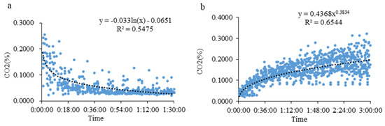 According to the variation in the CO2 concentration obtained from this analysis, the gas data from the light-controlled goat house from 9:30 to 11:00 and 16:30 to 19:30 were extracted. The results show that the change in the CO2 concentration in the goat house in the treatment group after the light period began at 9:30 accords with the logarithmic function: Y = −0.033 ln(X) − 0.0651 (X indicates the time after opening the door; Y indicates the concentration of CO2; Figure 3a). The change in the CO2 concentration after 16:30 accords with the power function relationship: Y = 0.4368X0.3834 (X indicates the time after closing the door; Y indicates the concentration of CO2; Figure 3b).