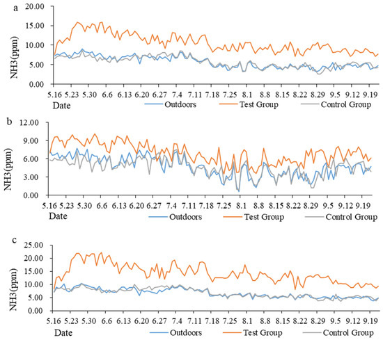 The variation trends in NH3 concentration throughout the experimental period. (a) The variation trends in NH3 concentration all day; (b) The variation trends in NH3 concentration during the light period (9:30–16:30); (c) The variation trends in NH3 concentration during the dark period (16:30–9:30 next day).