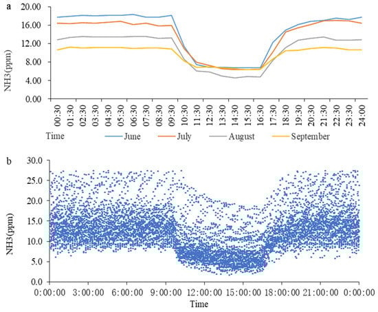 The variation trends in NH3 concentrations in the treatment group. (a) The variation trends in NH3 concentration in different months; (b) Summary of data regarding NH3 concentration.
