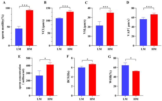 There were significant differences in various kinematic parameters of sperm between the LM and HM groups: (A) sperm motility (%), (B) VCL (curvilinear velocity, μm/s), (C) VSL (linear velocity, μm/s), (D) VAP (average path velocity, μm/s), (E) sperm concentration (million/mL), (F) BCF (beat/cross frequency, Hz), (G) WOB (wobble, %). * p < 0.05, *** p < 0.001. LM, low-motility group; HM, high-motility group.