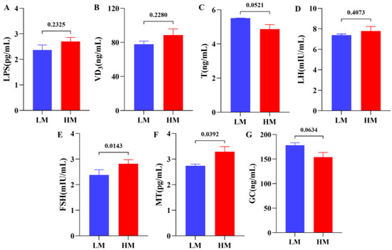 Serum physiological parameters between LM and HM groups: (A) LPS (lipopolysaccharides, pg/mL), (B) VD3 (vitamin D3, ng/mL), (C) T (testosterone, ng/mL), (D) LH (luteinizing hormone, mIU/mL), (E) FSH (follicle-stimulating hormone, mIU/mL), (F) MT (melatonin, pg/mL), (G) GC (glucocorticoid, ng/mL). LM, low-motility group; HM, high-motility group.