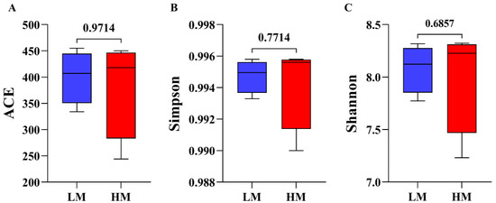 Alpha-diversity analysis of gut microbial community structure in LM and HM groups (A) ACE index: (B) Simpson index, (C) Shannon index. Red represents the HM group; blue represents the LM group. LM, low-motility group; HM, high-motility group.