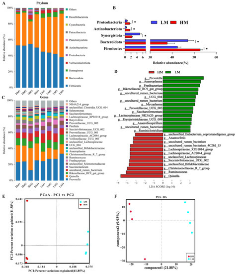 Rumen microbial composition and diversity between LM and HM groups of sheep. (A) Taxonomic composition of rumen microorganisms at the phylum level between the two groups. (B) Significantly differentiated microbes at the phylum level (* p < 0.05, determined by Wilcoxon rank-sum test). (C) Taxonomic composition of rumen microorganisms at the genus level between the two groups (1%, according to relative abundance). (D) LEfSe analysis at the genus level (LDA > 2). (E) PCoA analyses based on Bray−Curtis distance. (F) Analysis of the ruminal microbiota using PLS-DA. LM, low-motility group; HM, high-motility group.