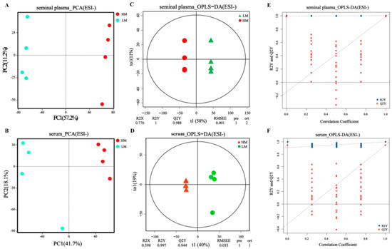 Two-dimensional plots of PCA scores according to serum and seminal plasma metabolomics in ion and negative ion modes are shown in Figure 5A,B and Figure S2. The two groups of samples were noticeably separated, indicating significant differences between the LM and HM metabolites. In addition, orthogonal partial least squares discriminant analysis (OPLS-DA) (Figure 5C,D and Figure S2) showed observed results, indicating that serum and seminal plasma metabolism differed between the two groups. From the replacement plots, the Q2-values were all lower than the R2-values, indicating the original model’s validity (Figure 5E,F and Figure S2).