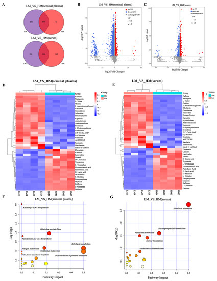 After UPLC-Q/TOF-MS/MS analysis, a total of 6172 metabolites were obtained from the metabolic profile of seminal plasma. LM and HM shared 5759 species, while 348 and 65 species were unique to LM and HM, respectively (Figure 6A, Supplementary Table S2). In addition, 5561 metabolites were obtained from serum samples. The two groups shared 5228, 228, and 105 metabolites specific to LM and HM (Figure 6A, Supplementary Table S3). Differential metabolites between these two groups were identified based on variable importance (VIP), fold change (FC), and p-value in the projection. We identified 1785 differential metabolites from seminal plasma samples, of which 511 metabolites were upregulated in HM, while 1274 metabolites were significantly enriched in LM (FC = 2, p = 0.05, VIP = 1) (Figure 6B, Supplementary Table S4). Similarly, 741 differential metabolites were identified in serum samples, 273 were upregulated in HM, and 468 were significantly enriched in LM (FC = 1.5, p = 0.05, VIP = 1) (Figure 6C, Supplementary Table S5). Between the LM and HM groups, 39 significantly different metabolites, such as eicosatetraenoic acid, catechol, L-histidine, D-lactic acid, D-leucic acid, L-glutamate, raffinose, and pantothenic acid were found in seminal plasma samples (Figure 6D, Table S3). A total of 35 significantly different metabolites were found in the serum species (Figure 6E, Table S4), mainly (S,E)-zearalenone, dopamine, eicosopentanoic acid, aciclovir, cAMP, cannabidiol, arachidic acid, and other metabolites.