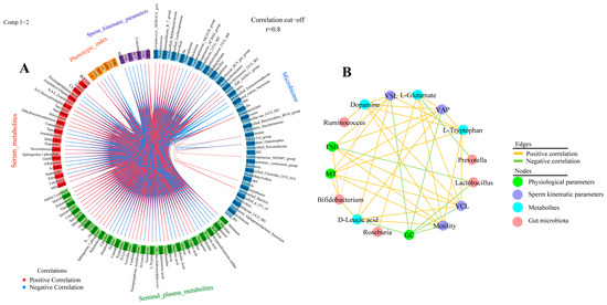 Microbiome and metabolome correlation analysis (A) Circos plot showing correlations between microbiome, serum metabolome, seminal plasma metabolome group, physiological parameters, and sperm kinematic parameters, with positive correlations indicated by red lines and negative correlations by blue lines. Only results for R > 0.8 are shown. (B) Based on DIABLO analysis results, Cytoscape shows correlations between key microbial genera, metabolites, physiological parameters, and sperm motility parameters.