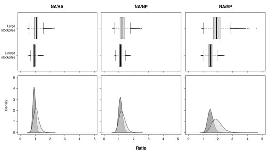 Distribution of the evolutionary rates ratios between NA and the reference genes (HA, NP, and MP from left to right). Data from countries with large antiviral stockpiles are represented in light gray, whereas those from countries with limited antiviral stockpiles are represented in dark gray.