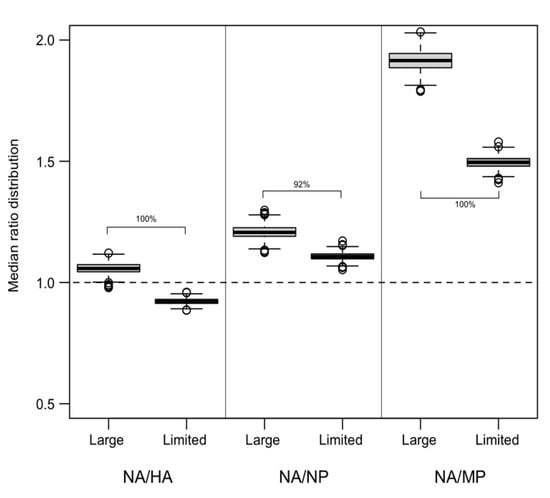 Finally, a total of 100 random ratio values from both cohorts were extracted for each gene pair. The two sample distributions were compared to support the hypothesis of faster evolution of NA in Large AS countries. A thousand repetitions were conducted to statistically support the results. As reported in Figure 2, the results suggest a faster NA evolution of viral strains collected in Large AS countries, showing a global shift of their distributions to higher values. Clear differences are evident if NA/HA and NA/MP comparisons are considered: 100% of the 1000 adjusted p-values were lower than 0.01. A partial overlap of the distributions of median ratios is detectable in the NA/NP case, highlighted by a percentage lower than 100% (92%) of significant results (Figure 2).