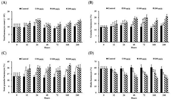 THC (A), GC (B), SGC (C), and HC (D) of Litopenaeus vannamei that received the PNWE at 50, 100, and 200 µg (g shrimp)−1 and control shrimp. Data are expressed as mean ± SD (n = 8). Different superscript letters indicate that the same exposure time significantly differs (p < 0.05) among groups (Duncan’s multiple range tests). PNWE: Panax notoginseng water extract.