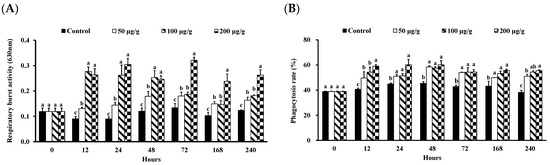 RB (A) activity, PR (B), and PI (C) of Litopenaeus vannamei that received the water extract of Panax notoginseng at 50, 100, and 200 µg (g shrimp)−1 and control shrimp. Data are expressed as mean ± SD (n = 8). Different superscript letters indicate that the same exposure time significantly differs (p < 0.05) among groups (Duncan’s multiple range tests).