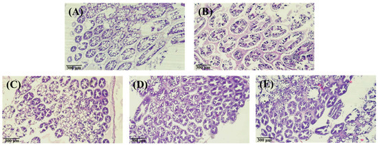 The hepatopancreas and intestinal tissues were fixed in 10% neutral-buffered formalin for two days. Then, they were dehydrated progressively with alcohol at different concentration gradients (70%, 95%, 100%) before encapsulation. The paraffin-embedded tissues were cut into 5-µm thick pieces using a cutter. The pieces were then fixed on a microscope slide using protein glycerol and stained through hematoxylin-eosin (H&E) staining. The samples were mounted on the microscope slides using cover glasses, and the prepared tissue samples were observed under an upright phase-contrast microscope (H600L, Nikon, Tokyo, Japan).