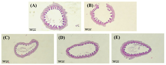 The intestines were weighted and homogenized using a tissue homogeneous solution (containing 100 mM Tris-HCl; 0.1 mM ethylenediaminetetraacetic acid; 0.1% Triton X-100, Sigma-Aldrich, St. Louis, MO, USA). The crude enzyme solution was obtained from the supernatant after the solution was centrifuged at 5600× g for 30 min at 4 °C. A mixture of 3 mL buffer (containing pH 8.0, 50 mM Tris-HCl, and 20 mM calcium chloride, Sigma-Aldrich, St. Louis, MO, USA) and 0.5 mM N-benzoyl-L-arginine ethylester (BTEE; Sigma-Aldrich, St. Louis, MO, USA) were placed into a cuvette with 100 µL of the crude enzyme solution. The absorbance at 253 nm at the first and third minutes was measured using a spectrophotometer [22]. The equation is as follows:
