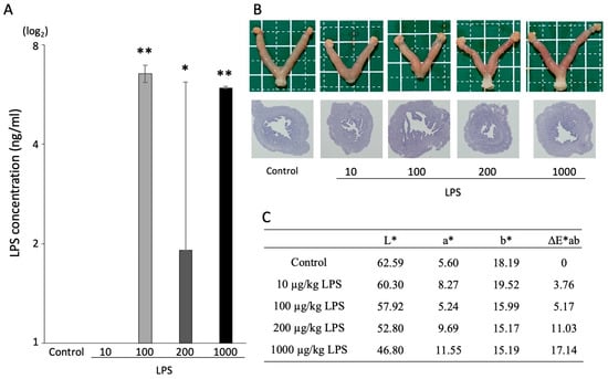 Female ICR mice (10–12 weeks old) were used to examine the effects of LPS administration on the uterus. Mice received an intraperitoneal (i.p.) injection of LPS at concentrations of 0, 10, 100, 200, or 1000 μg/kg. Then, 6 h after LPS administration the mice were sacrificed and blood samples were collected from the heart to measure the LPS concentration. Thereafter, the uterus was removed and washed in phosphate-buffered saline (PBS). Total RNA extracted from the uterus was used for gene expression analysis by immunoreaction. To analyze the immune response, the uterine color after LPS injection was measured using a CM-700d spectrophotometer (Konica Minolta, Tokyo, Japan). The color indicators included the following: L*: lightness, a*: redness, and b*: yellowness. Furthermore, to assess the morphology of the uterus, samples were fixed in 10% formalin (066-06821, Fujifilm Wako, Osaka, Japan), dehydrated using an ethyl alcohol series, embedded in paraffin, and stained with hematoxylin and eosin (H&E) staining. Images were obtained using a ZEISS Axio Zoom microscope.V16 for Biology (Carl Zeiss AG, Oberkochen, Germany) and the software ZEN 3.1 pro (Carl Zeiss AG).