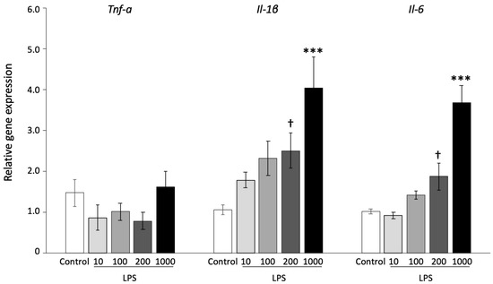 To examine the effect of LPS in uteruses, mice were administered 0, 10, 100, 200, or 1000 µg/kg LPS by i.p. injection. The high concentration of 1000 μg/kg LPS was administered to identify whether LPS clearly induced an acute inflammation. The administration of 100, 200, and 1000 µg/kg LPS significantly increased the concentration of LPS in plasma compared with the control group (Figure 1A, p < 0.01). To assess the inflammatory reaction, uterus color was measured by spectrophotometry. The value of L* (lightness) and a* (redness) displayed an inflammatory-like appearance in an LPS dose-dependent manner (Figure 1B,C). The expression of genes related to inflammatory responses was examined in the uteruses. Compared with the control group, the expression of Tnf-α did not significantly change following LPS administration, whereas that of Il-1β and Il-6 demonstrated an increasing trend following the administration of 200 µg/kg LPS (p < 0.1) and significantly increased with 1000 µg/kg LPS (Figure 2, p < 0.001).