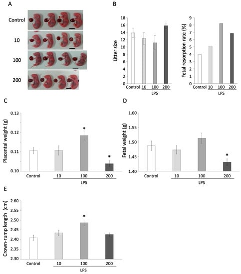 Effect of LPS for fetal development. Mice were administered 0, 10, 100, or 200 µg/kg LPS at 0.5 dpc (control n = 7, each LPS group n = 6). The fetal parameters were measured at 18.5 dpc. (A) Appearance of the litters in each group. (B) Litter size and fetal resorption rate. (C) Placental weight. (D) Fetal weight. (E) Crown–rump length. The values are shown as mean ± SEM (control n = 97, 10 µg/kg LPS n = 74, 100 µg/kg LPS n = 67, 200 µg/kg LPS n = 95) and * p < 0.05.