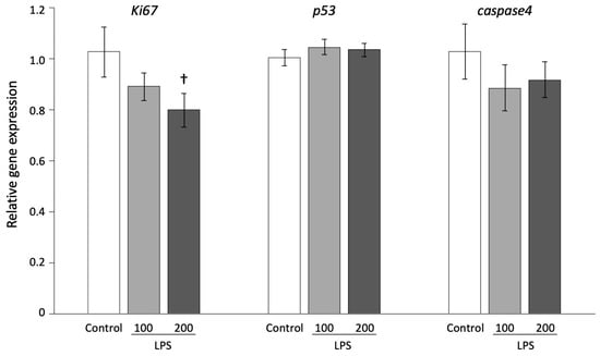 To examine the effect of LPS exposure at fertilization on embryonic development, we injected 0, 10, 100, or 200 µg/kg LPS into pregnant mice at 0.5 dpc. The pregnant mice were sacrificed at 18.5 dpc, and the effects of LPS exposure on litter size, fetal resorption rate, placental weight, fetal weight, and CRL before birth were examined (Figure 3A). The litter size and resorption rate were not affected at any concentration of LPS at 0.5 dpc (Figure 3B). However, 100 µg/kg LPS significantly increased the placental weight (0.118 ± 0.002 g) and CRL (2.487 ± 0.015 cm) compared with the control group (placental weight: 0.111 ± 0.002 g, fetal weight: 1.488 ± 0.016 g, CRL: 2.410 ± 0.014 cm) at 18.5 dpc (Figure 3C,E, p < 0.05). We also found that 200 µg/kg LPS significantly decreased the placental weight (0.104 ± 0.001 mg) and fetal weight (1.431 ± 0.011 g) compared with the control group (Figure 3C,D, p < 0.05). This indicated that the administration of LPS at 0.5 dpc affected late embryonic development. To reveal the molecular mechanisms underlying these effects, gene expression of the fetal tissue was analyzed after LPS administration. The expression of Ki67, which is related to the cell cycle, showed a decreasing tendency at 200 µg/kg LPS compared with the control group (Figure 4, p < 0.1), whereas the expression of p53 and caspase4, which are related to apoptosis, were not affected by LPS.