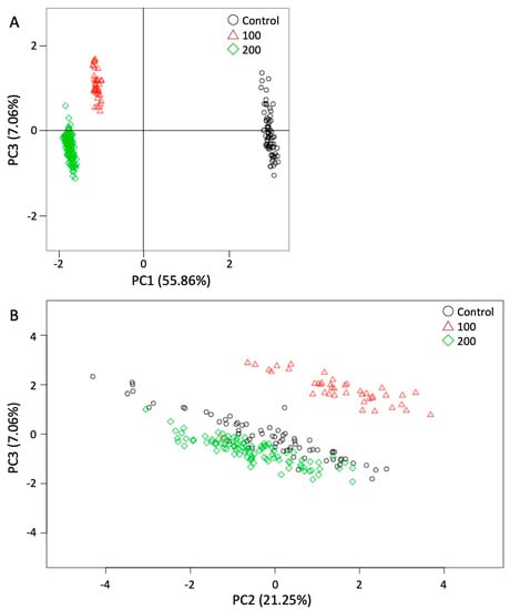 PCA performed using LPS concentration, fetal parameters, and gene expression. (A) Plot of PCA using PC1 and PC3. (B) Plot of PCA using PC2 and PC3. ○: control, △: 100 µg/kg LPS, ◇: 200 µg/kg LPS.