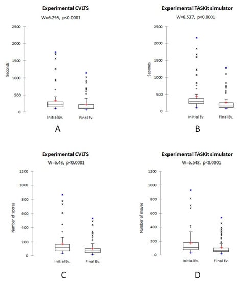 Comparison of the experimental group’s mean training time (A,B) and the mean number of movements (C,D). Data are presented for CVLTS (A,C) and TASKit (B,D) simulators.