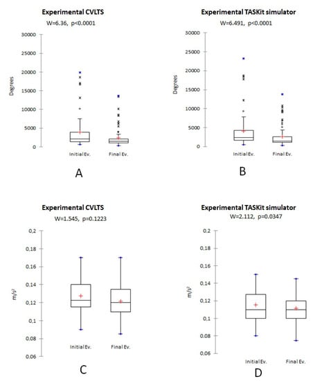 Comparison of the experimental group mean angular displacement (A,B) and mean smoothness in movements (C,D). Data are presented for CVLTS (A,C) and TASKit (B,D) simulators.