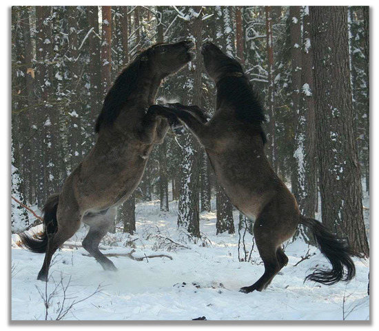 Figure 2. Fighting Konik stallions, Popielno sanctuary, Poland (photo by Michał Bruzda).