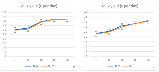 (a,b) Mean milk yield during the experimental period 1–60 days postpartum. CO-M: control multiparous cows, FL-M: flaxseed and lupin treated multiparous cows, CO-P: control primiparous cows, FL-P: flaxseed and lupin treated primiparous cows.