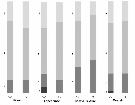 The sensory panel was composed of 14 participants aged from 22 to 65 years. The panelists were requested to record their opinion on the flavor, appearance, and body and texture of 12 cheese samples from each group, cut into small cubes with a 2 cm3 mass. All parameters were set up on a hedonic scale from 1 (negative perception) to 9 (positive perception). The scale from 1 to 3 corresponded with low level of acceptance, from 4 to 6 with acceptance, and from 7 to 9 with very high acceptance. Panelists were also asked to record supplementary comments if necessary. Each participant provided scores for all samples from both treatment groups.