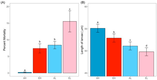 Percent mortality (A) and length (B) of oyster larvae held at different pCO2 and food conditions (mean ± standard error). The different letters (a through d) denote significant differences between treatments (G-tests with pairwise post hoc tests for A, and nested ANOVA and Tukey post hoc tests for B). Labels along the x-axis denote treatment codes with the first letter representing pCO2 condition (A = ambient, E = elevated) and the second letter designating food level (H = high, L = low).