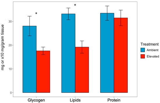 Concentrations of glycogen (mg/g tissue), lipid (mg/g tissue) and protein (×10 mg/gram tissue) in mantle tissue from oysters held in ambient or elevated pCO2 (mean ± standard error, asterisk denotes significant differences between treatments, nested t-test, p < 0.05, n = 2).