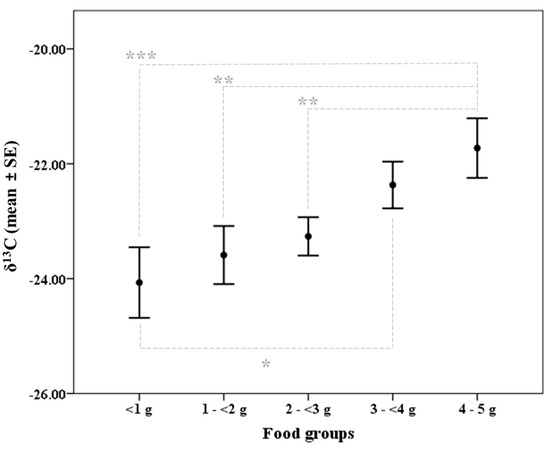 δ13C values in relation to food groups. Grey broken lines and associated asterisks indicate significant differences between connected groups (* p < 0.05, ** p < 0.01, *** p < 0.001).