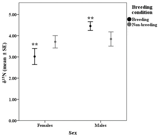 δ15N values due to sex and breeding condition of individuals. Asterisks indicate significant differences (** p < 0.01).