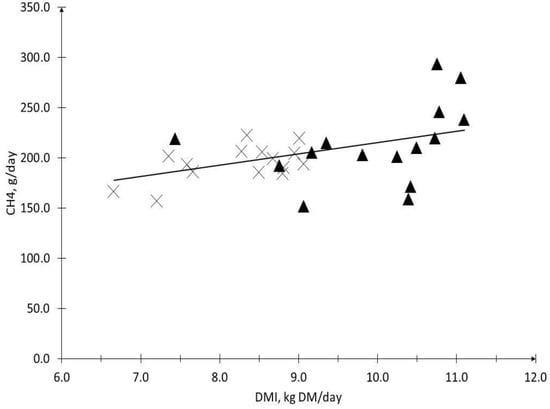 The effects of diet quality on CH4 production also vary as a function of the quantity of the feed intake [,,]. A higher feed intake results in higher CH4 emissions, mainly due to the increment in the amount of feed that is available for fermentation. This relation was shown by Boadi and Wittenberg [], who evaluated the effects of cattle breed type and forage quality on the methane production under ad libitum, and restricted the feeding conditions. In both situations, the level of feed that was offered affected the CH4 production, and the dry matter intake (DMI) was strongly correlated with methane production (r2 = 0.8).