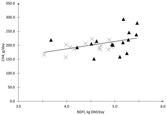 It is known that low quality diets with a high NDF content may favor and stimulate the methanogenic processes in the rumen [,]. However, studies that have aimed to explain how the increment in NDF intake affects the CH4 emissions have come to no clear conclusions. For example, Primavesi et al. [] compared the CH4 emissions from animals that were fed with two sugarcane varieties with contrasting NDF values (44.2% and 54.7% NDF) and found that, despite no difference in the intake, the use of the lower NDF variety produced 30% less CH4 emissions than the higher NDF diet. On the other hand, Hammond et al. [] evaluated the addition of NDF to chopped straw and soy hulls, (+47 g/kg DM) in two types of forage diets (corn silage and grass silage), finding no difference in the intake but also no difference in the methane emissions. Both studies included supplementation with different feeds, and this could be hiding the actual effects of reducing the NDF content on the measured variables.