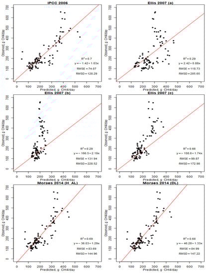 Observed vs. predicted CH4 emissions value plots using 97 observations (black points) from 29 different studies in the six models selected. Regression lines are shown in red. RMSE: Root means square error; RMSD: Root means square deviation; and r2: Pearson’s coefficient.