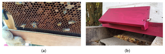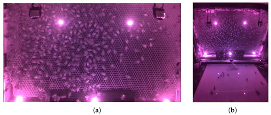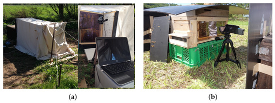 Example of outdoor studies with observation hives: (a) Observation hive of type “array-frame” with two vertical frames and sheets as a sun visor [26]; (b) Observation hive of type “side-glass” with 10-frame Langstroth hive and black plastic panels as sunlight shield [27].