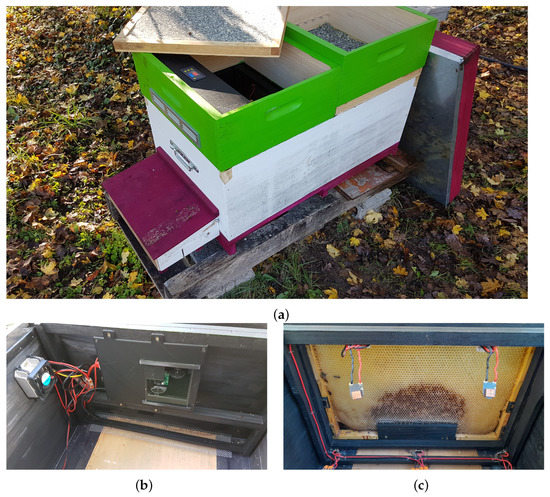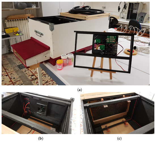 Photos of the hive before implantation in the apiary: (a) Full overview; (b) View of the embedded system in place; (c) View of the dance floor.