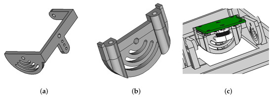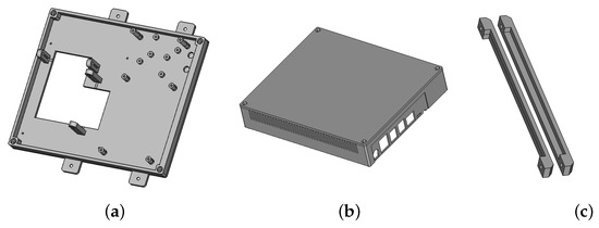 In order to fix all the electronic elements together, with the possibility of adjusting the alignment of the camera, it was necessary to create six different parts. The first part was the front of the box (Figure 7a). It contained an “L” shaped hole and four legs to hold the two cameras. Six studs of 3mm were designed to support the Grove relays under the Grove hat which was supported by two studs of 22 mm and the Jetson GPIO. The Jetson was fixed on four studs of 9mm. Four ears were present to fix the box on the wood frame. Two of them were aligned with the detection camera to facilitate the centering of the box on the frame. The second part was the box cover (Figure 7b). On one side, cavities have been added to allow access to the Jetson ports. Another niche was added to leave a pass to the LED supply wire managed with the relays. Two ventilation grilles with 2 mm wide holes have been made at the bottom and top of the cover to facilitate natural air convection. The third and fourth parts were two glass holders screwed on the box front at the top and the bottom of the camera hole (Figure 7c). A small “invisible” glass (84 × 108 × 2 mm) (Figure 2b) keeps the electronics free of honeybees and protects the camera lens. The holding system was modeled in order to easily change the glass without tools.