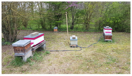 A ventilated empty independent hive, called “power supply hive” (PSH), contained the electrical and data networks. In this hive, an ethernet switch broadcasted the network via ethernet cables and a 230 V/12 V ventilated transformer was supplying the power to the embedded systems. This last one was associated with a ventilated regulator (8–40 v/5 v) (BgoodVision 10 A 50 W) supplying the LEDs, the Jetsons and the fans (Figure 4b) inside the studio (Figure 4b). This regulator is necessary to absorb voltage variation induced by temperature differences. Before using this set up the hive was powered by three meters wires connected to a 230 v/5 vs. transformer lodged into the PSH. However, with high temperatures, the resistance of the cables increased leading to voltage drops on the Jetson and conducted to the shutdown of the system. Moreover, this 12 vs. tension offers the possibility to connect the hive to a solar power station, leading to an energy-independent system. We also used low DC voltages to limit electromagnetic pollution [32,33]. Cables with a section of 2 × 0.75 mm2 supplied all the electronic elements and the external cables (electrical and ethernet) were protected by a sheath.