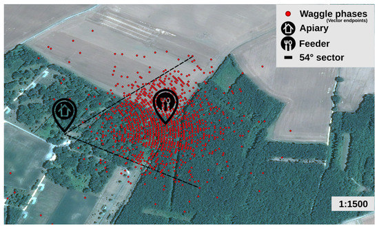 The majority of the points on the waggle phases map (Figure 13) are centered on the feeder and included in a visual sector of 54° which is in agreement with the known inaccuracy of waggle phase direction [1,35]. A large number of points allowed us to see the concentric curves due to the sampling frequency (60 Hz). The approximate distance between the two curves is 6 m. Sampling quality is sufficient in relation to the precision of the search area visible on the map (Figure 14).