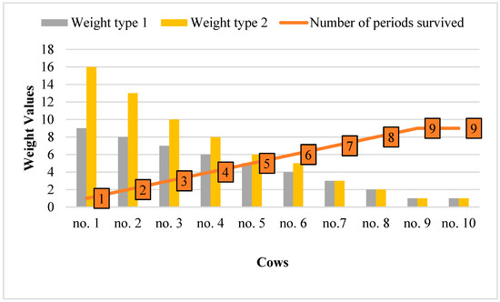 Following the methodologies proposed by Heise et al. [30], we used nine consecutive periods covering the first three calving intervals, each divided into three periods. An individual goes through these nine periods during their life, which it will or will not survive. Survival is marked ‘100’ and non-survival ‘0’. At each period, the individual encounters contemporaries within the herd–year–season (HYS). Weights were determined on a small artificial set of 10 different individuals. The first individual did not survive the first period and had only one record; only the tenth individual survived all nine periods and had nine records. Each period of an individual’s life was in a different HYS period. The size of all HYSs was complemented to 20 individuals.