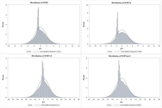 The values for each period are listed in Table 6. The highest survivability values were for the periods at the beginning of each calving interval and the lowest were at the end calving interval. In absolute terms, the figures for the calculations with weights were higher. The BVs had standard deviations of 1.75 and 2.18 in the case without weights and 6.20 and 6.04 in the case with weights (w2). Figure 2 shows the frequency distribution of breeding values according to the models for survivability [SURV], functional survivability [SURVm], weighted survivability [SURVw2], and functional weighted survivability [SURVmw2]. Although we are evaluating a binary trait, the results of the random effect of BV showed a continuous, near-normal frequency distribution.