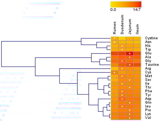 Hierarchical clustering of amino acid concentrations in tissue harvested from the rumen, duodenum, jejunum, and ileum of lactating Holstein cows (n = 8/group). Dendrograms allow the visualization of clusters of similarity in concentration patterns (links denoted by the lines at the left side of the picture). Concentration levels are denoted by shades of yellow and red according to the log2-transformed least-squares mean. Red intensity denotes a high concentration and yellow intensity a low concentration. White dots denote the highest concentration of an amino acid in a given tissue.