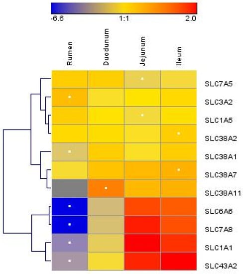 Hierarchical clustering of amino acid transporter abundance data in tissue harvested from the rumen, duodenum, jejunum, and ileum of lactating Holstein cows (n = 8/group). Dendrograms allow the visualization of clusters of similarity in abundance patterns among genes between treatments (links denoted by the lines at the left side of the picture). Cutoffs for abundance level are denoted by the shades of blue, yellow, and red according to the log2-transformed least-square mean. Red intensity denotes high expression, and blue intensity indicates low expression. White dots denote the lowest or highest mRNA abundance for each gene.