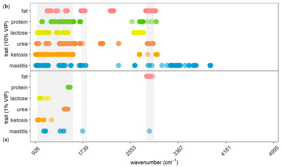 Representation of (a) 1% and (b) 10% of the most important wavelengths selected for the respective trait presented on the y-axis. Wavelengths for mastitis and ketosis were selected by partial least squares discriminant analysis and wavelengths for fat%, protein%, lactose%, and urea were selected by partial least squares regression. Gray areas indicating most informative areas according to Grelet et al. [33].